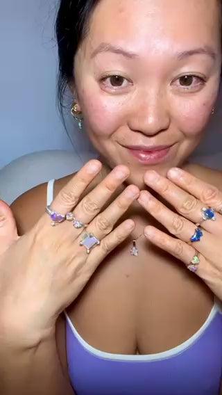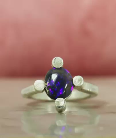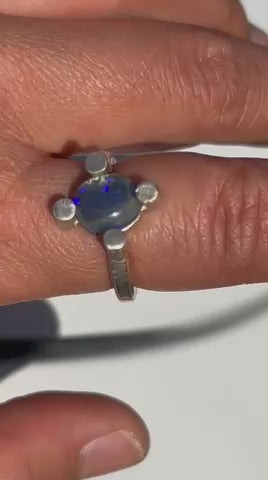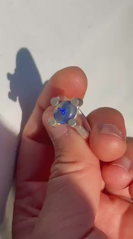 Introducing our Glass Galaxy Ring! Handmade with stunning Lightning Ridge crystal opal, this ring features sparkling blues and is set on a unique Argentium Silver (940) post ring band. Perfect for adding an otherworldly touch to any outfit.