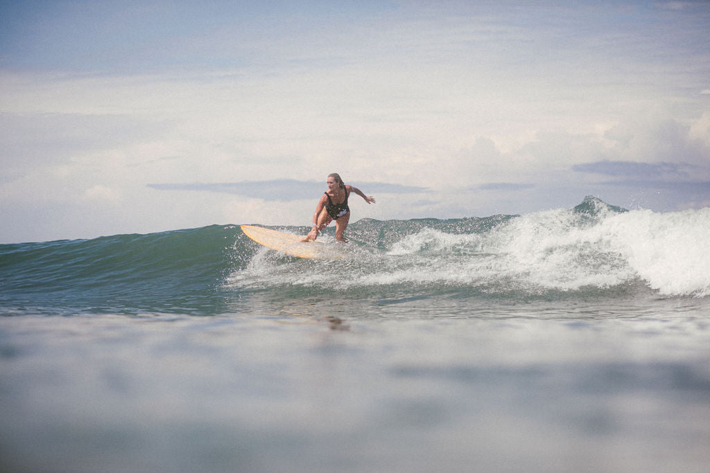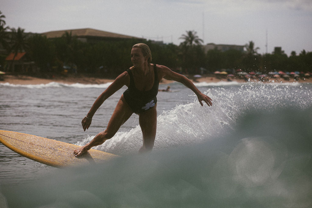 A fresh take on the timeless black fullsuit. Crafted from recycled matte lycra, the Posy One Piece blends vintage styling with surf functionality. Designed for full coverage and support in all conditions, this suit features a retro mod-style white Posy flower patch, a flattering scoop neckline, and a subtle back waist seam to hug the natural curve of the body. With an in-built internal shelf bra, secure elastic finishes, and zig-zag stitching for extra stretch, this suit stays put — even in heavy surf. Finished with a vintage-inspired Atmosea woven tag, it’s a go-to piece you’ll keep reaching for, season after season.