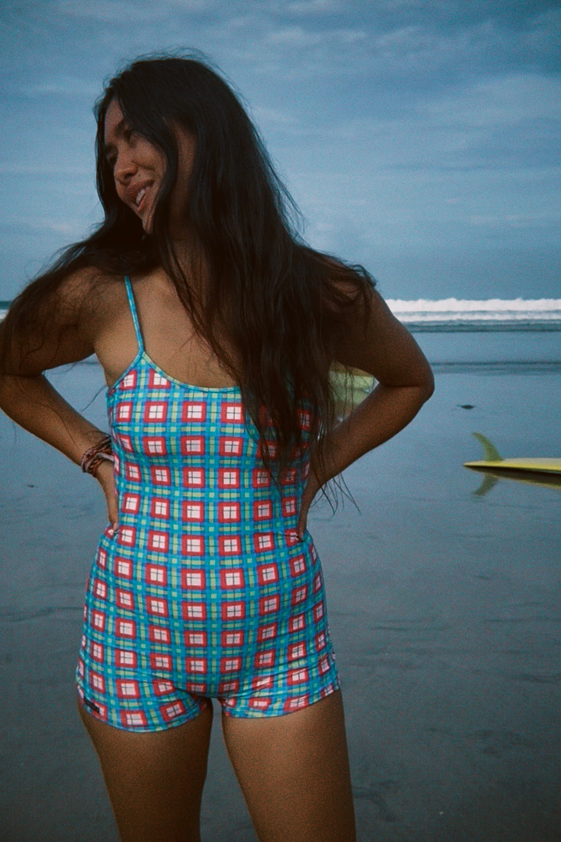 A romper with adjustable straps for extra comfort and a built-in bra shelf for maximum support. A combination of style and function, with boy-length legs and a super flattering feminine low back.