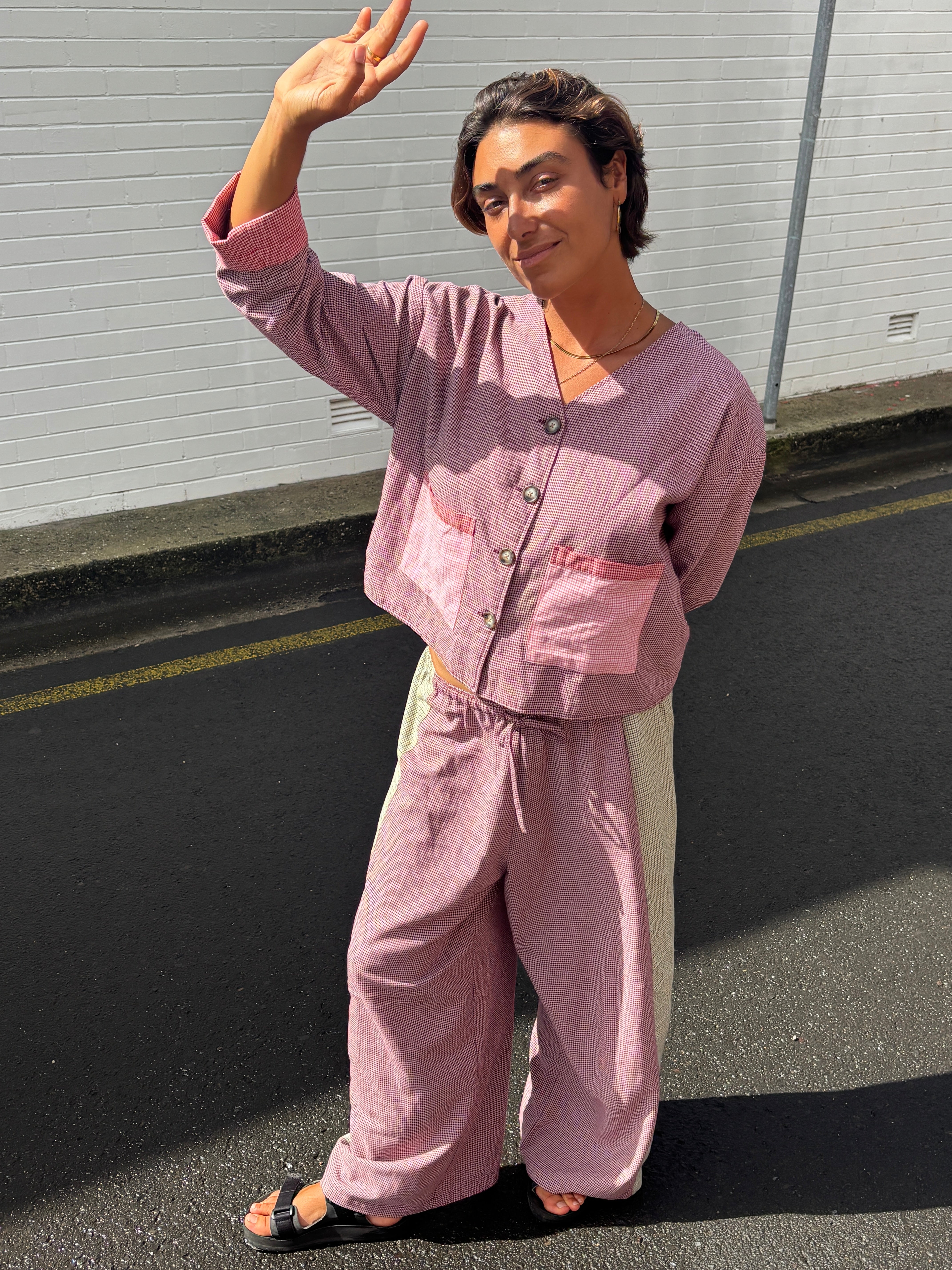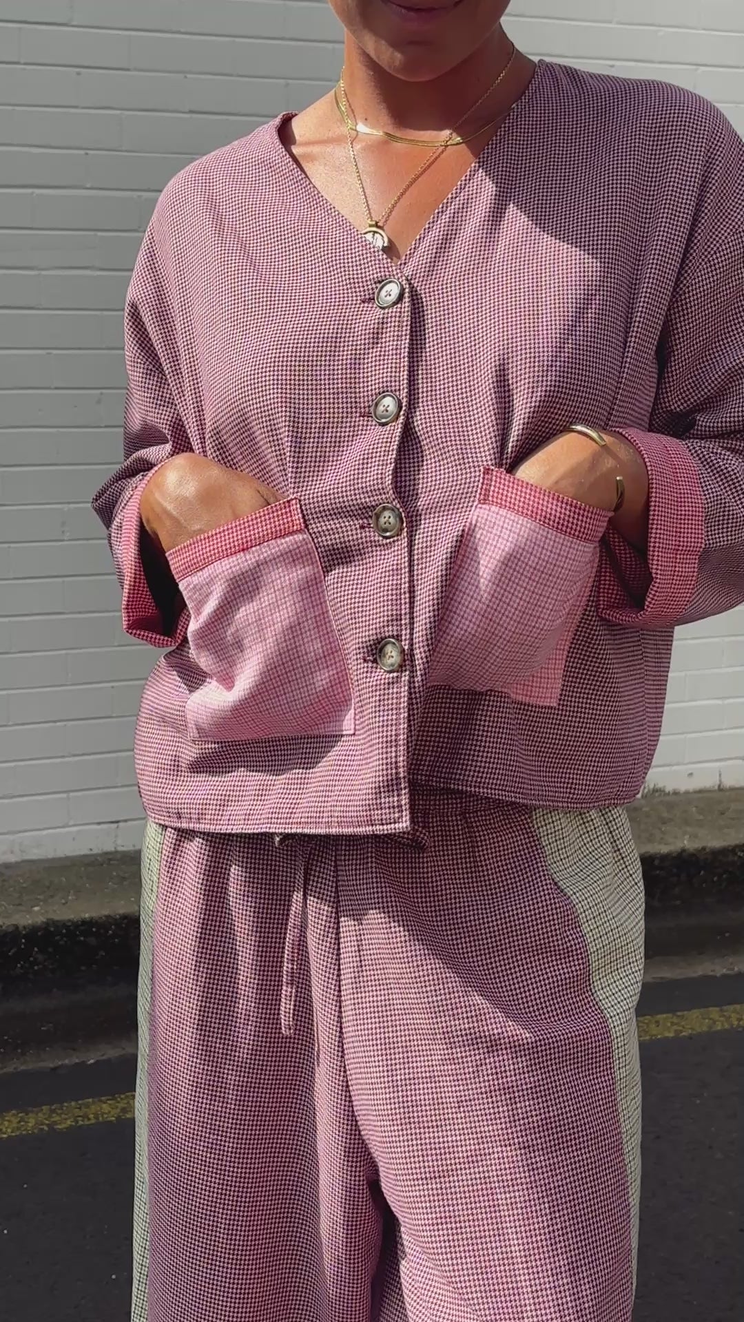 A playful take on softened workwear, made for layering through the in-between seasons. Crafted from breathable linen and fully lined for light warmth, this mix-match houndstooth piece features a clean, boxy silhouette with dropped shoulders and a slightly cropped length.