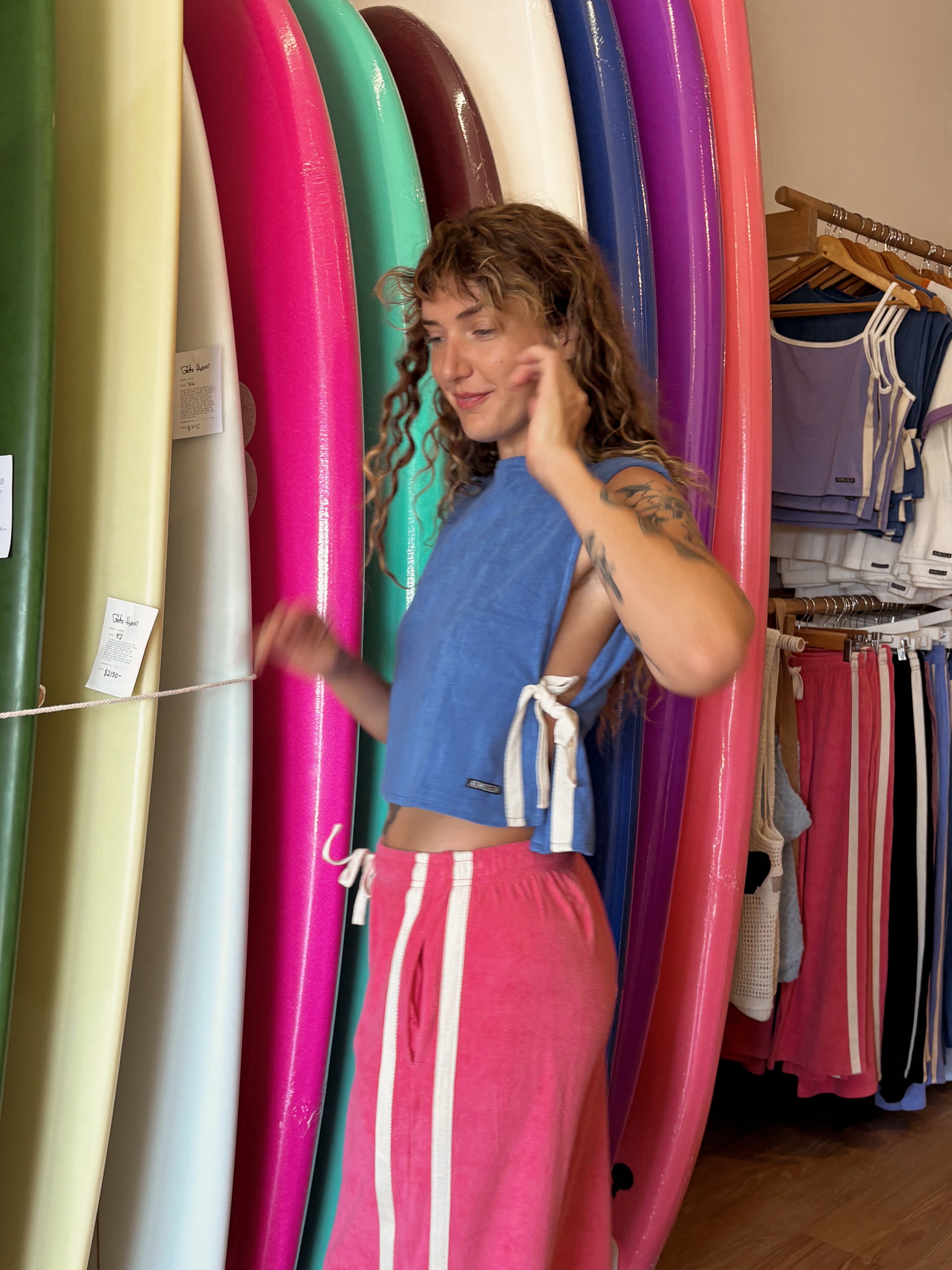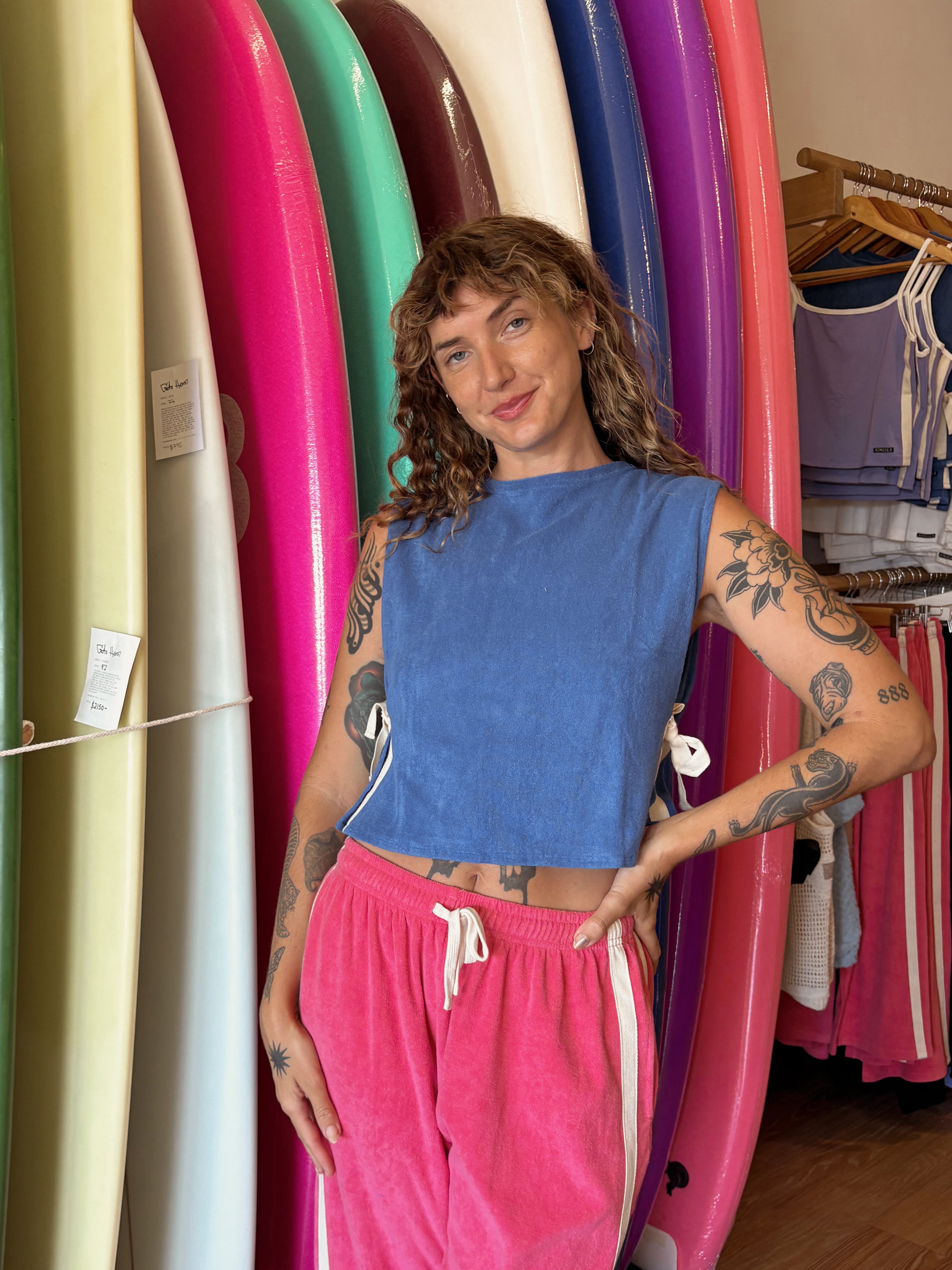 A sporty tank top reimagined in our signature towelling. Side ties and cotton canvas stripes give it a fresh, functional twist. Summer ease with a retro edge.